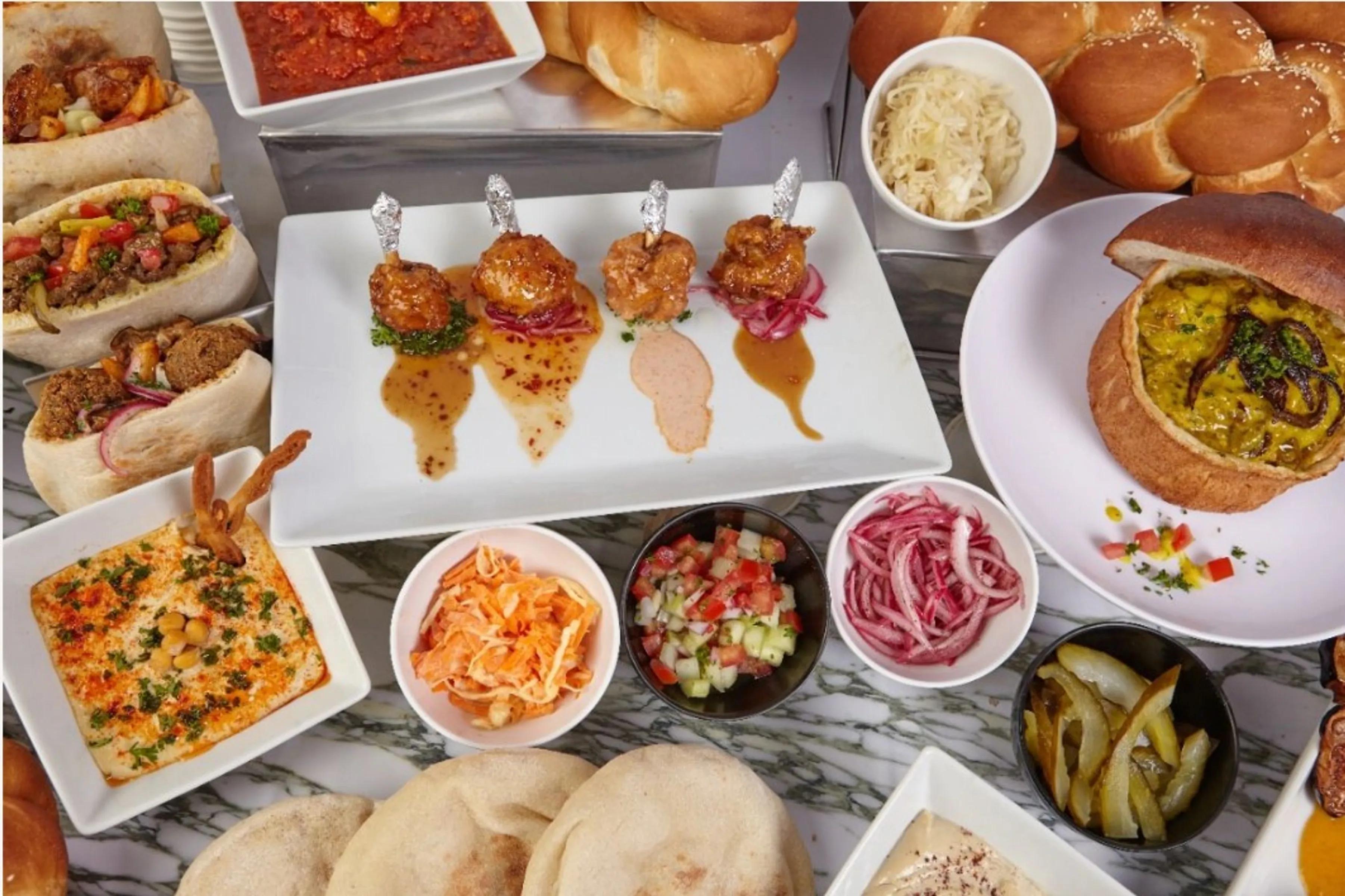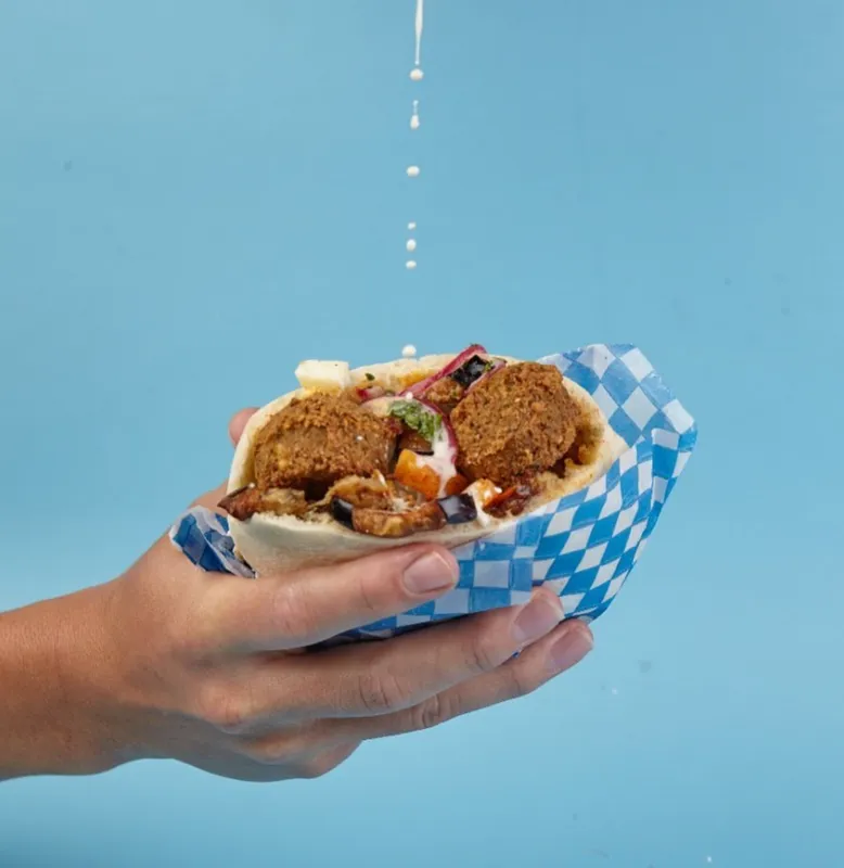 Pita rellena con kebab asada a la brasa, tahine, hummus, ensaladas y papas a la francesa.