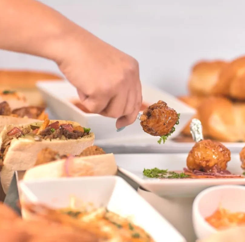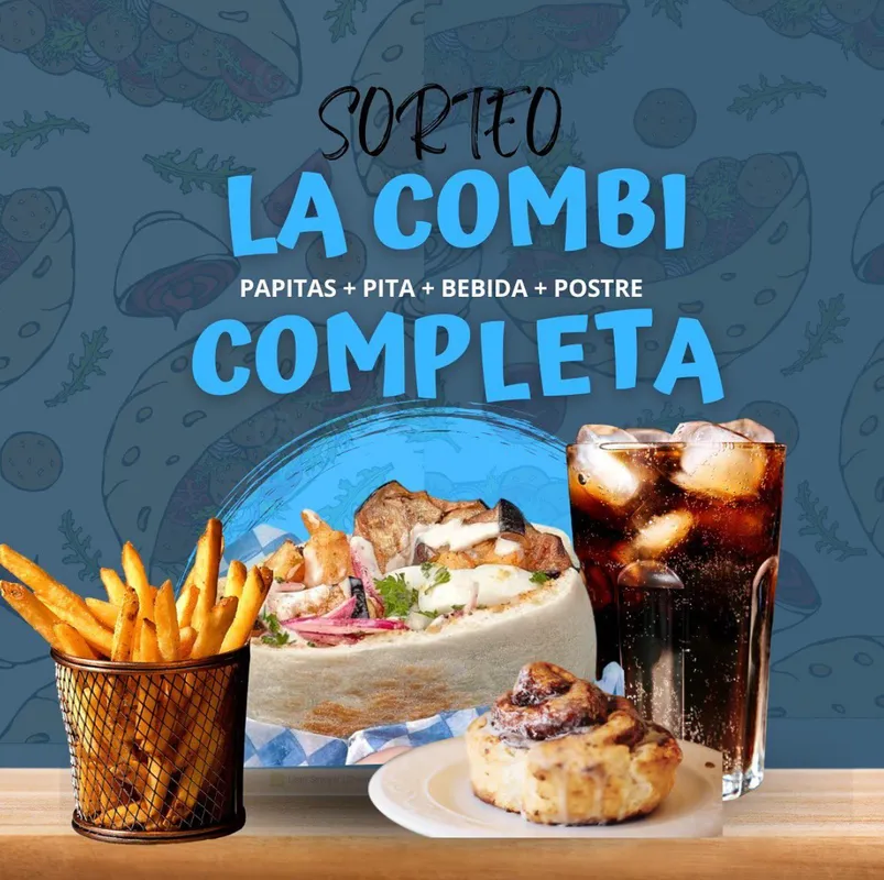 Pita rellena con deliciosa pechuga de pollo apanada acompañada con salsas, ensalada, tahini, hummus y papas a la francesa.